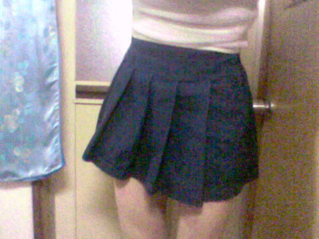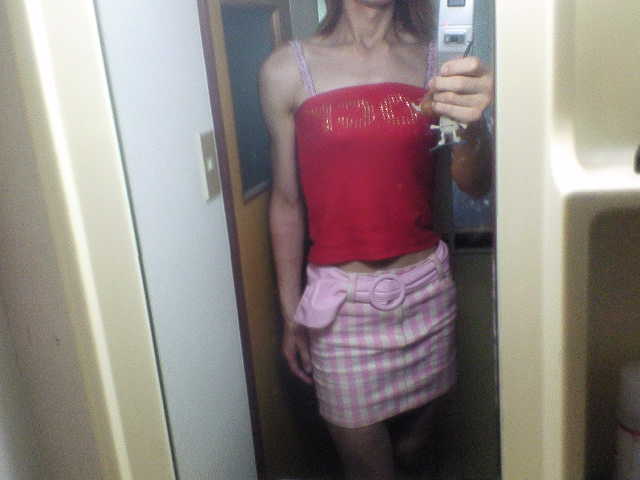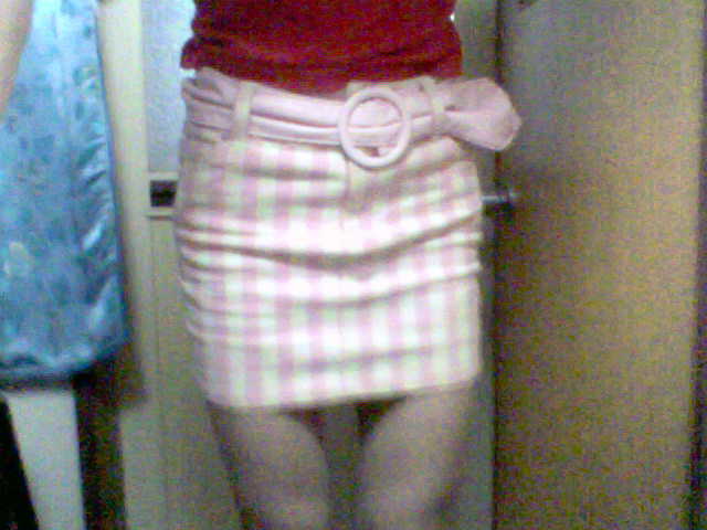 赤のチューブトップに、ピンクのチェックのミニスカートを合わせました。
